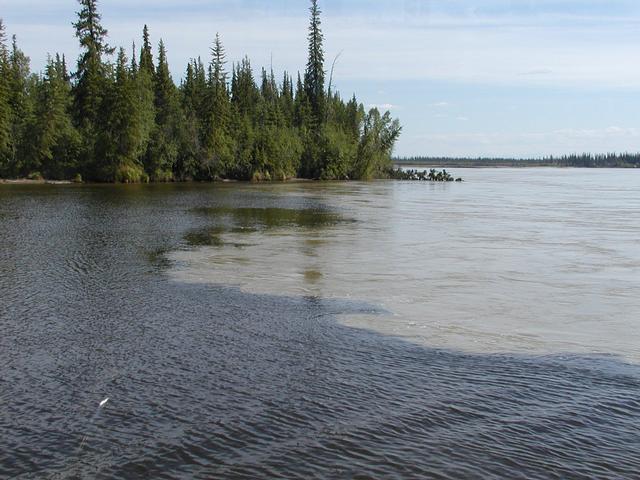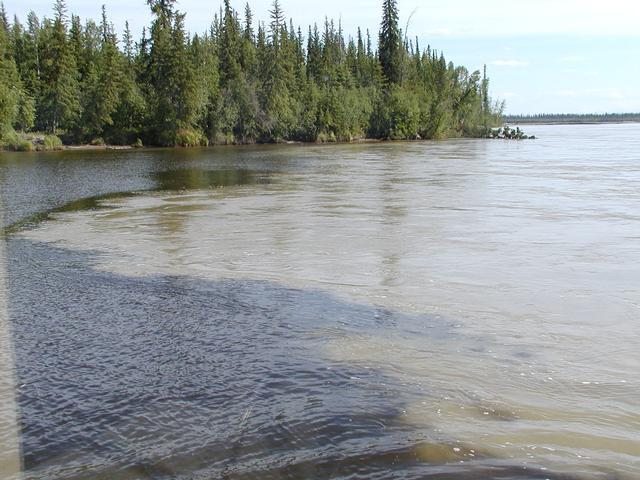 There it is - the clear, blue waters of the Chena mixing with the brown, silty Tanana.