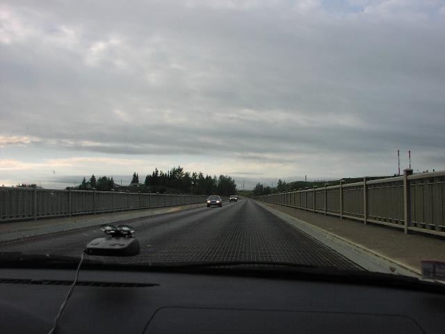 Rob's picture: Crossing the bridge in the previous picture. That's a suspension bridge carrying a pipeline across the Peace River.