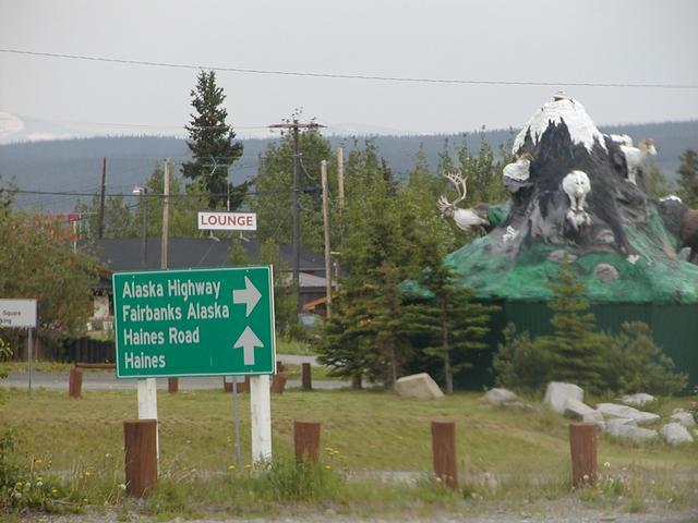 Another sign, with a silly looking monument behind it. Those animals are bigger than the mountain!