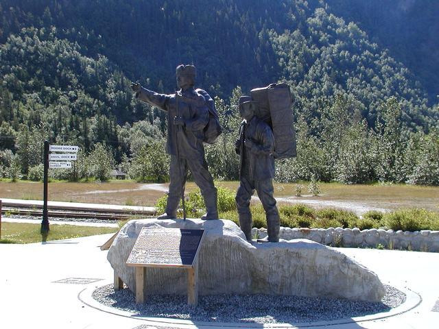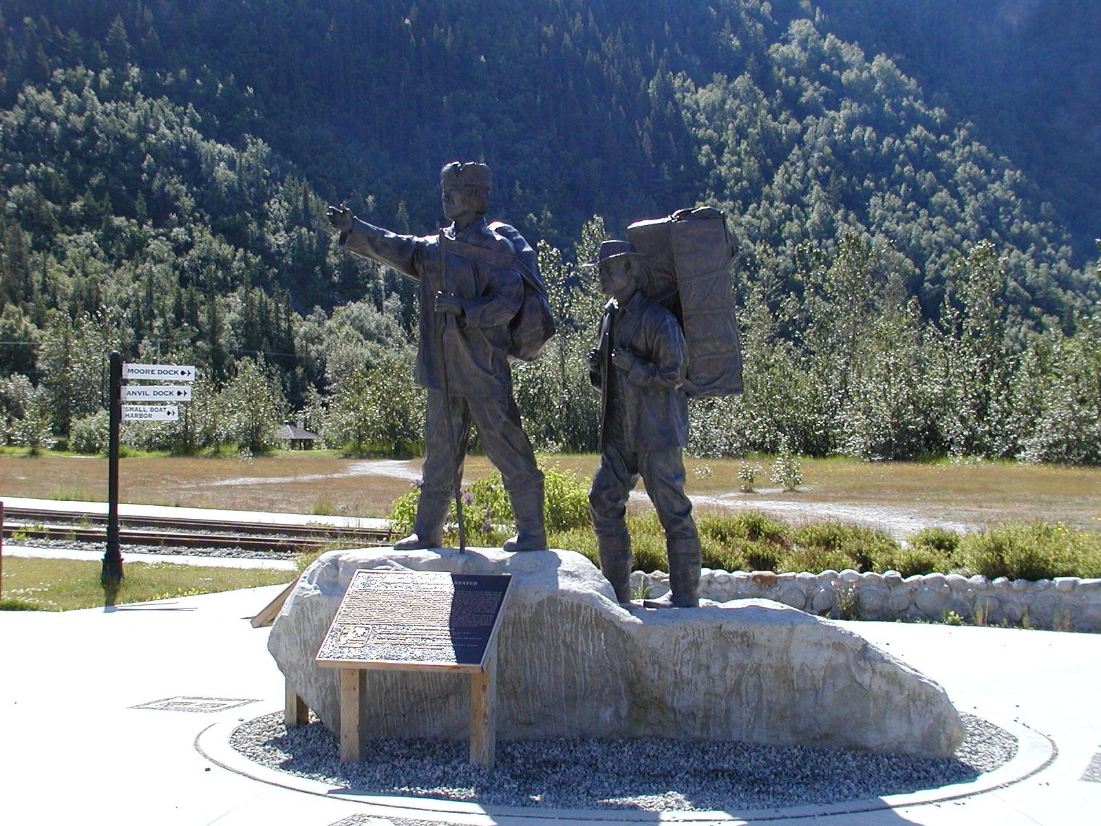 Gold rush centennial statue in a park in Skagway.