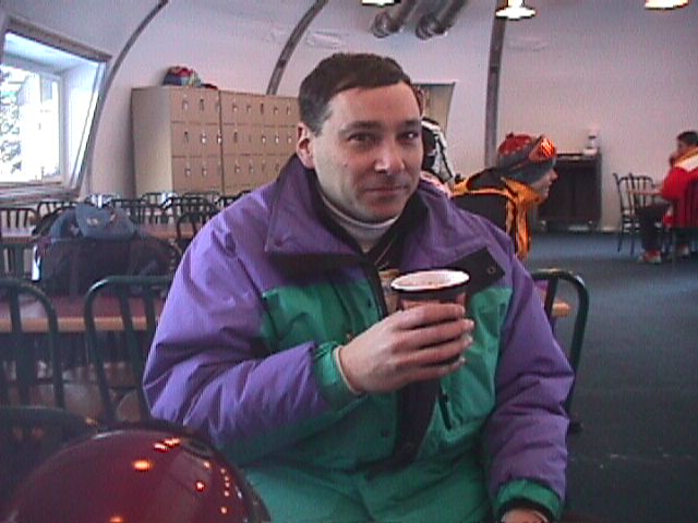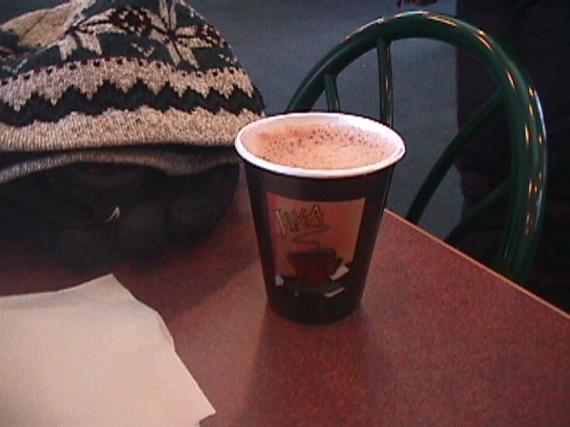 Mike and his hot chocolate at the Java Hut. Mike suggested an alternate caption: "Mike is a dork."