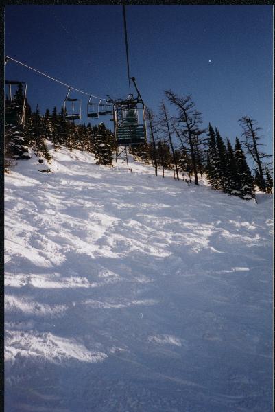 Our ride up the Tee Pee Town double begins. At this point it's very nice. No one on the lift ahead of us. Good looking terrain below. Those trees are growing straight up. Too bad once we got past these trees, it got very cold and windy.