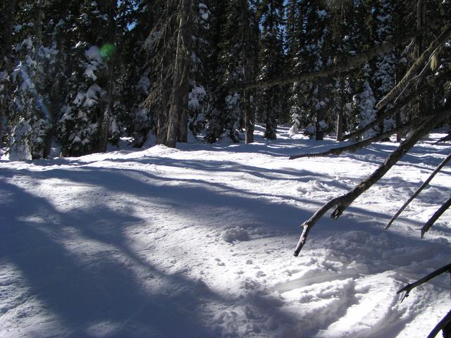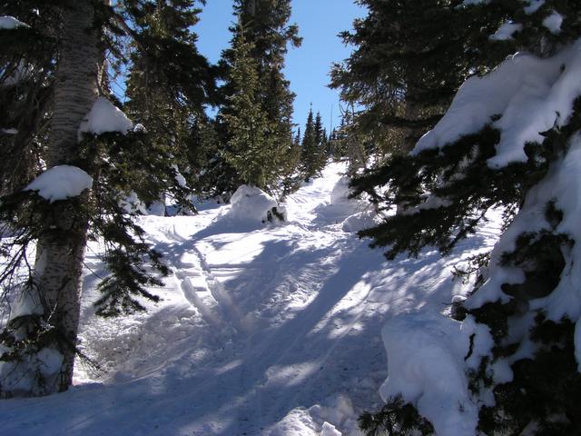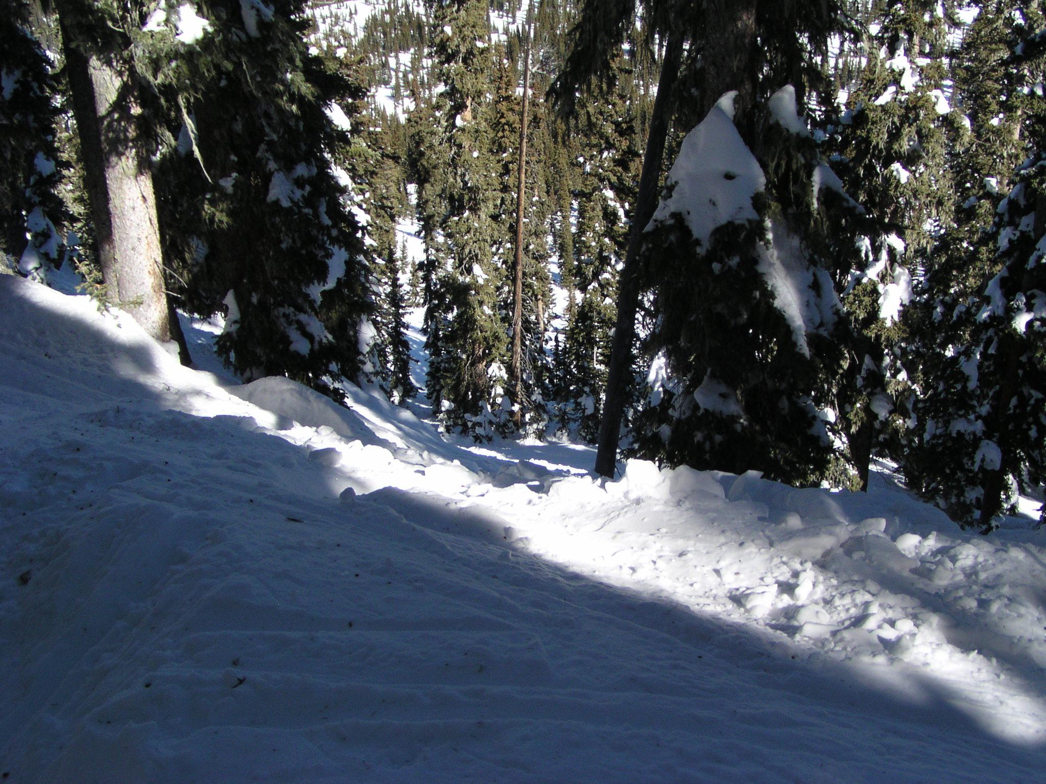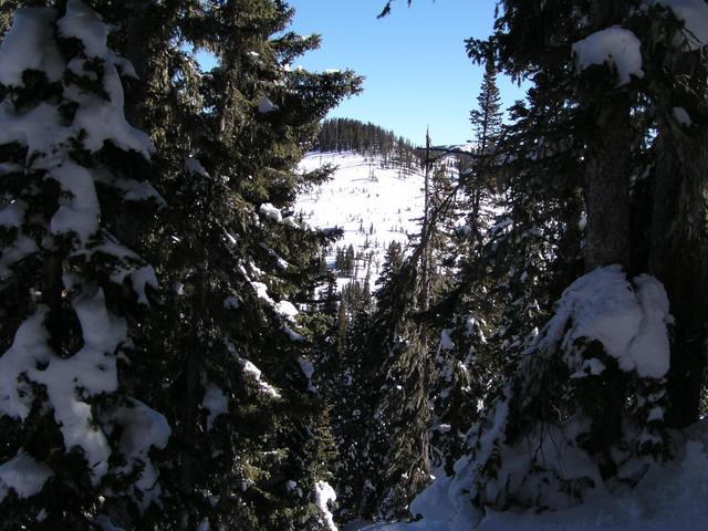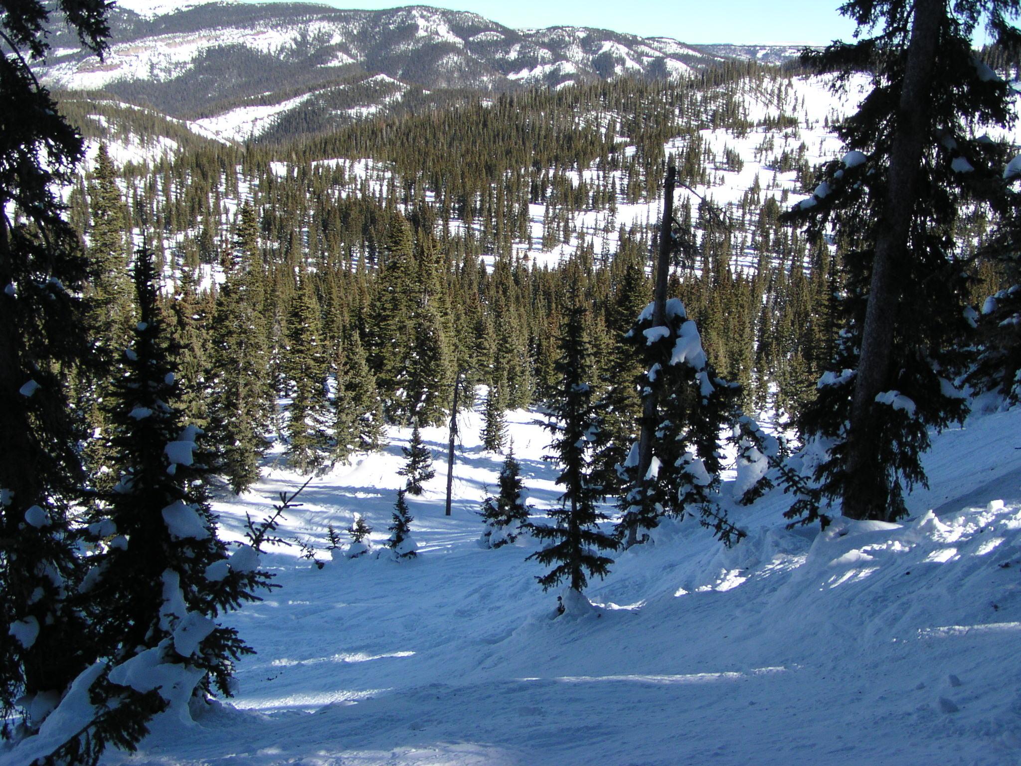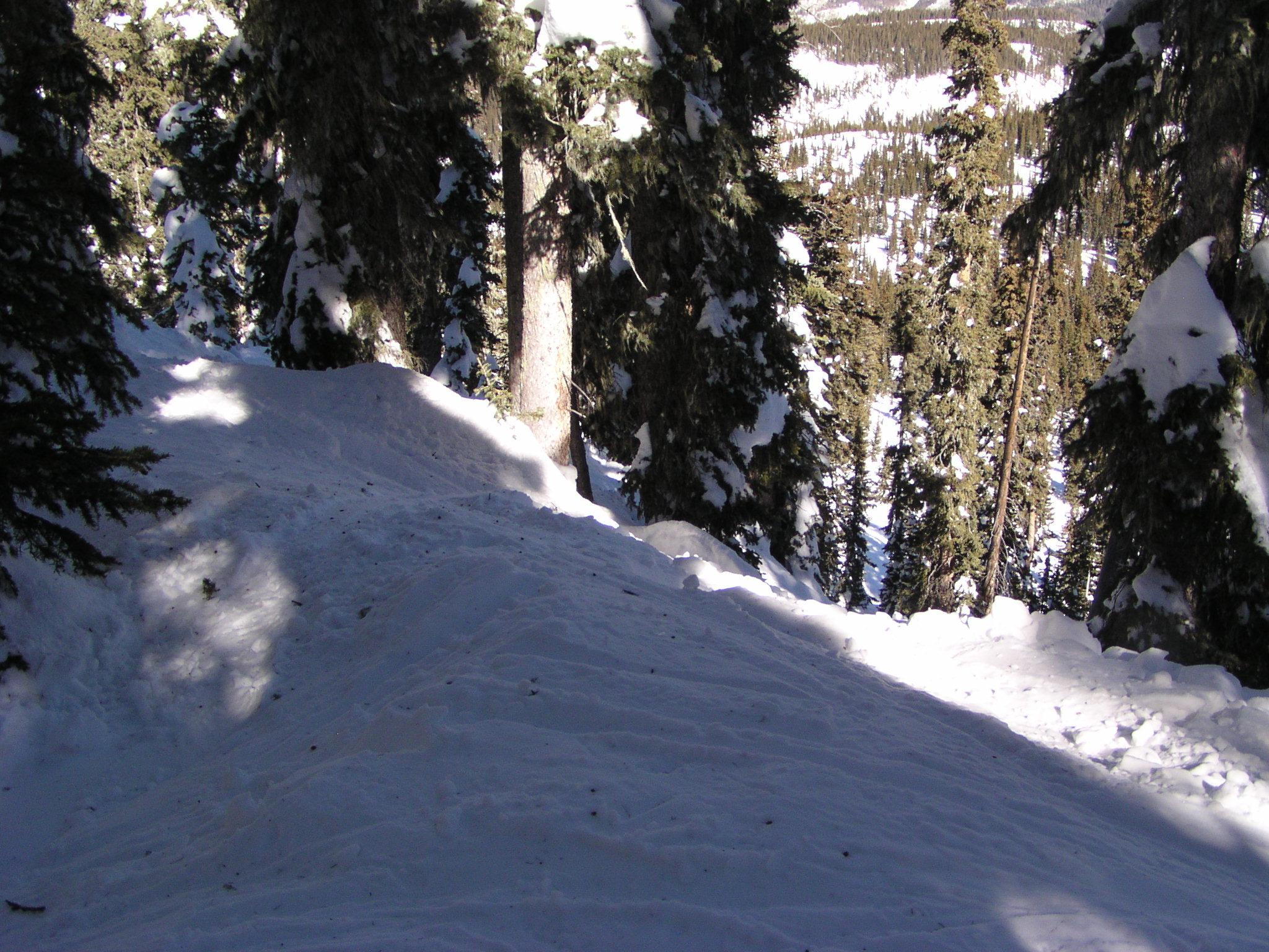 Looking down at Shazam, a nice trail through the steep trees.