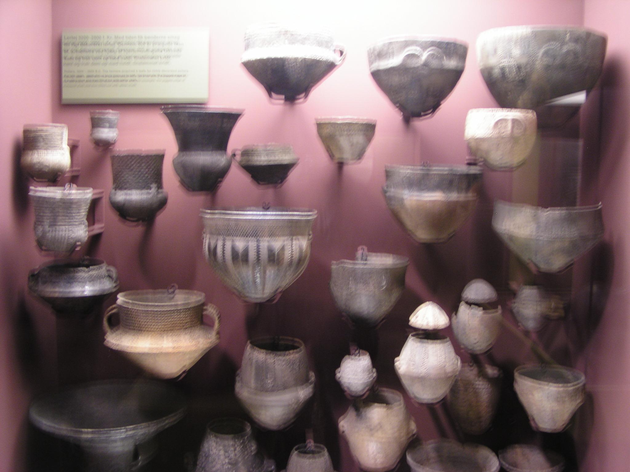 Blurred pottery display in the prehistory section.