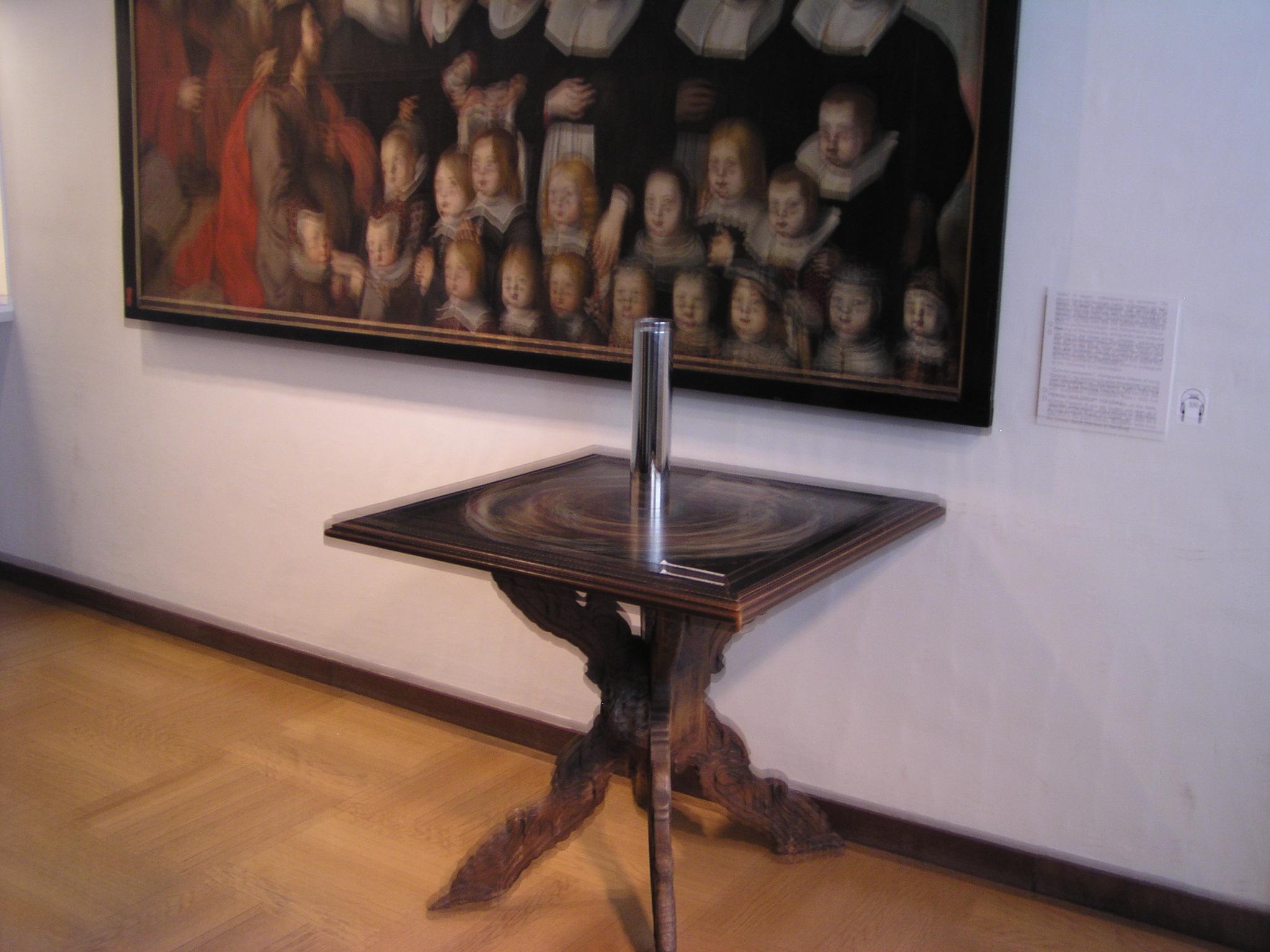 A painting that looks like a swirl, but which is visible in its reflection in the cylindrical mirror.