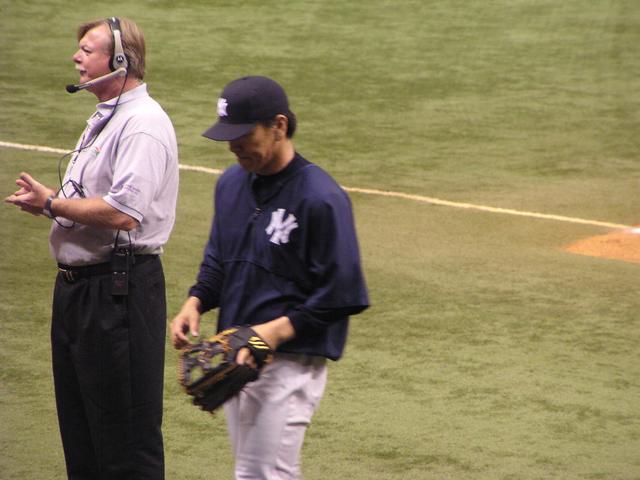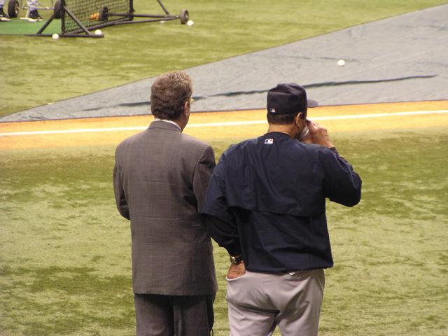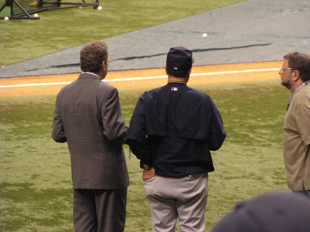 John Sterling getting ready to tape his pre-game interview with Joe Torre.