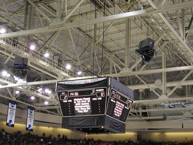 Emergency! There is part of a beer ad showing. So they're lifting the scoreboard to fix it.
