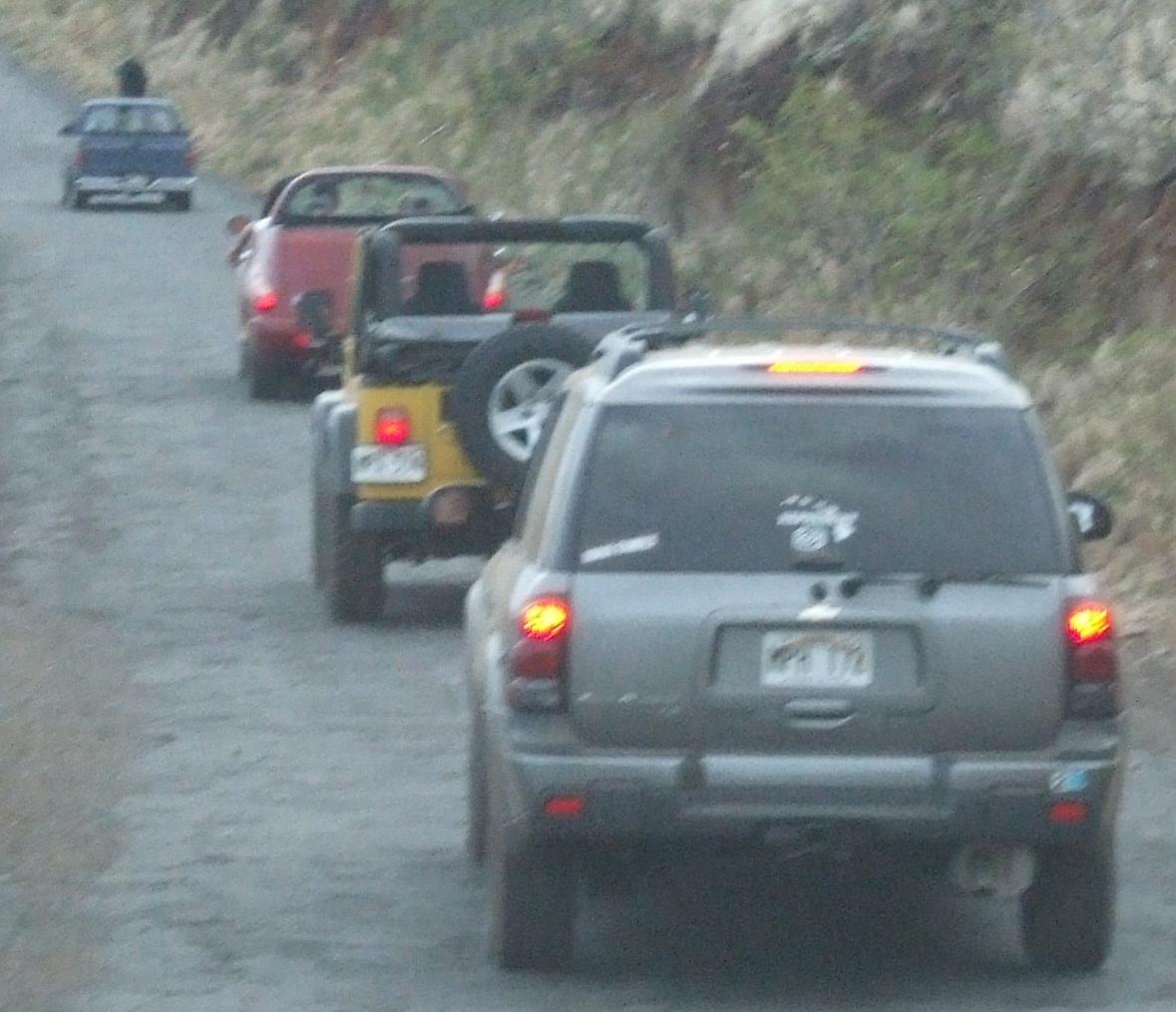 The procession following a very slow blue truck. Later in the ride,