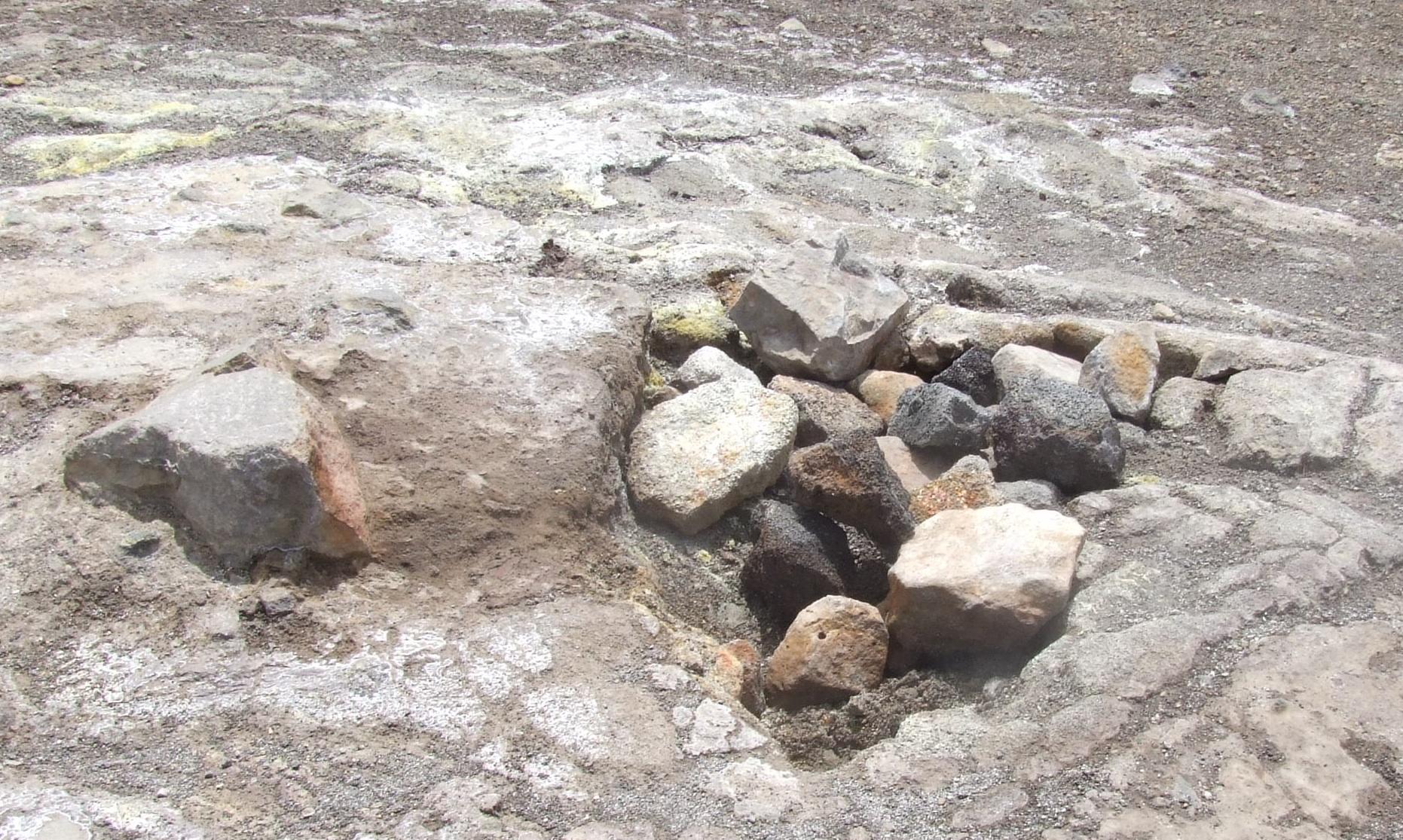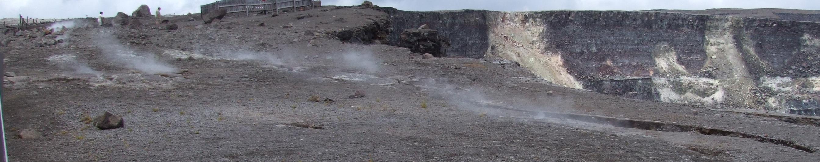 Steam vents along a crack in the crater's edge.