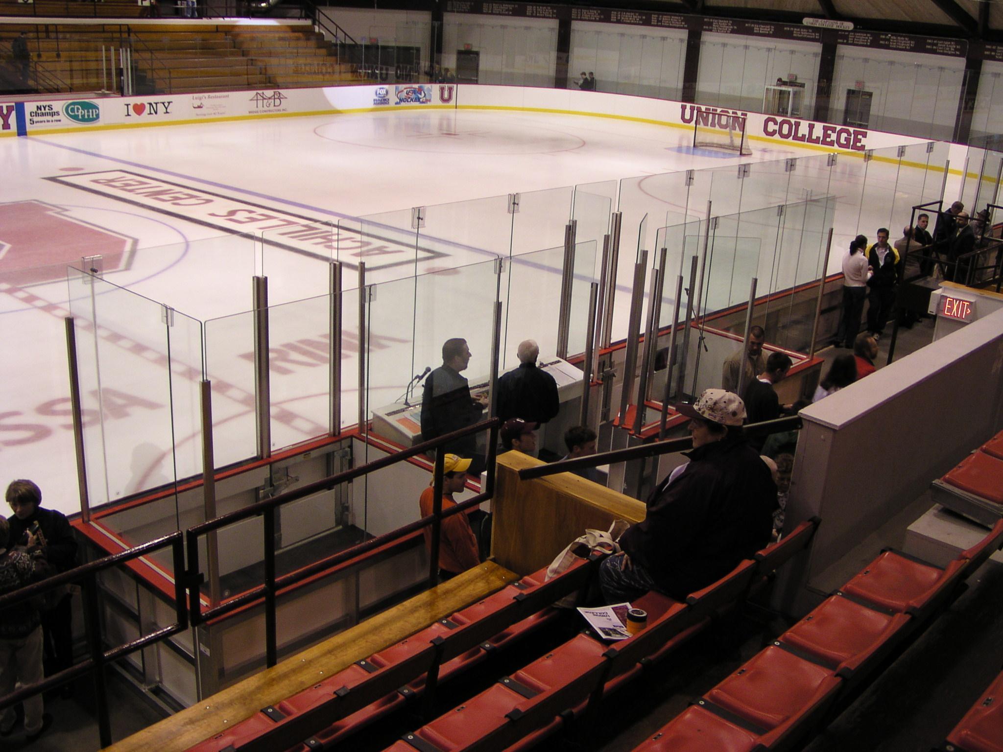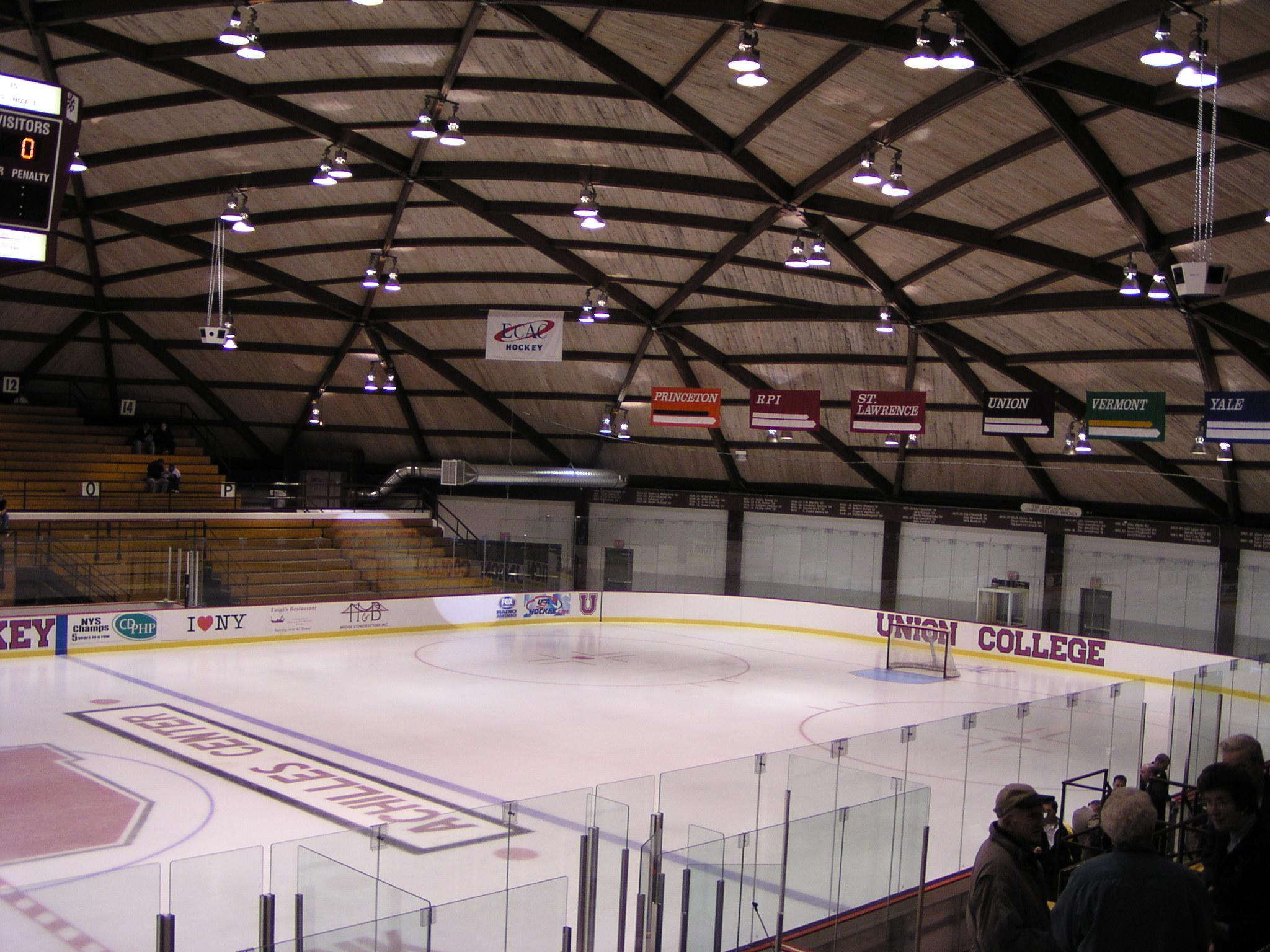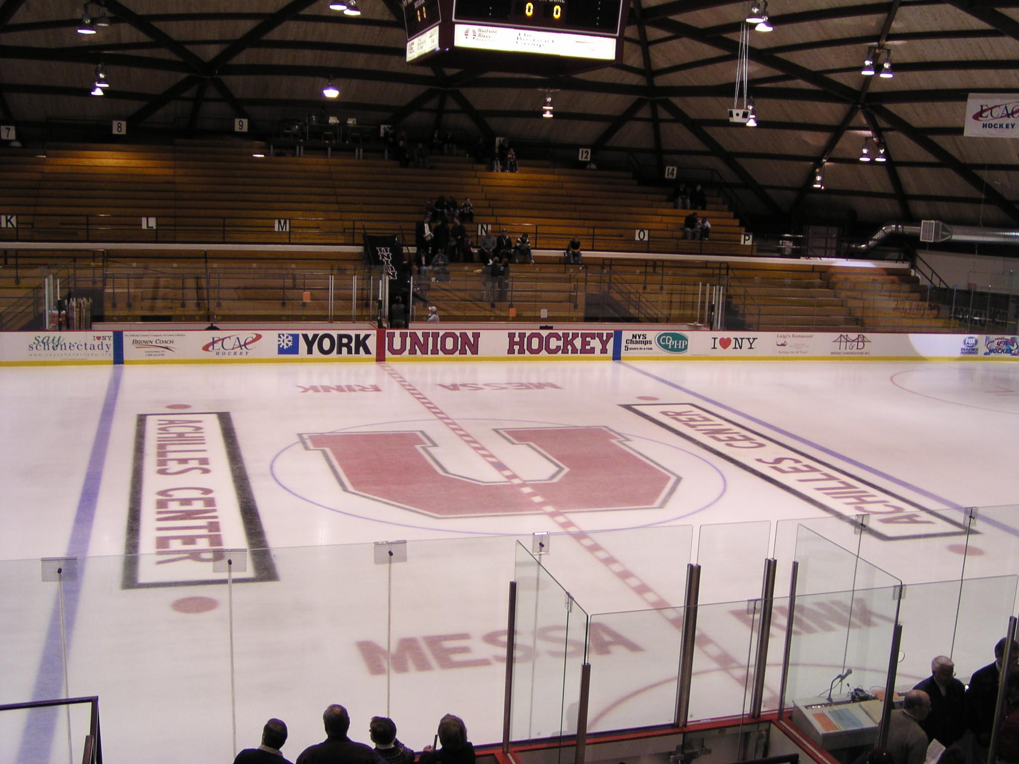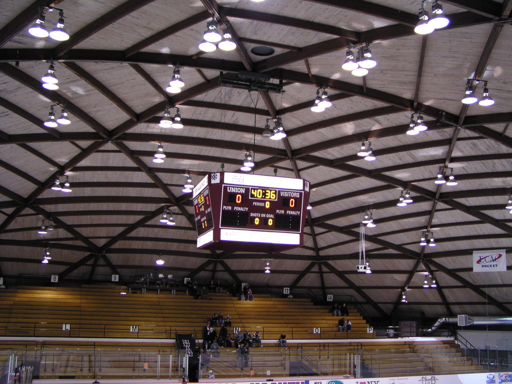 New center ice overhead scoreboard. We can keep track of shots on goal! It's been a while since Union had an overhead scoreboard.