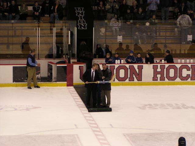 Nate Leaman presents former Union goaltender Wayne MacDougal with the