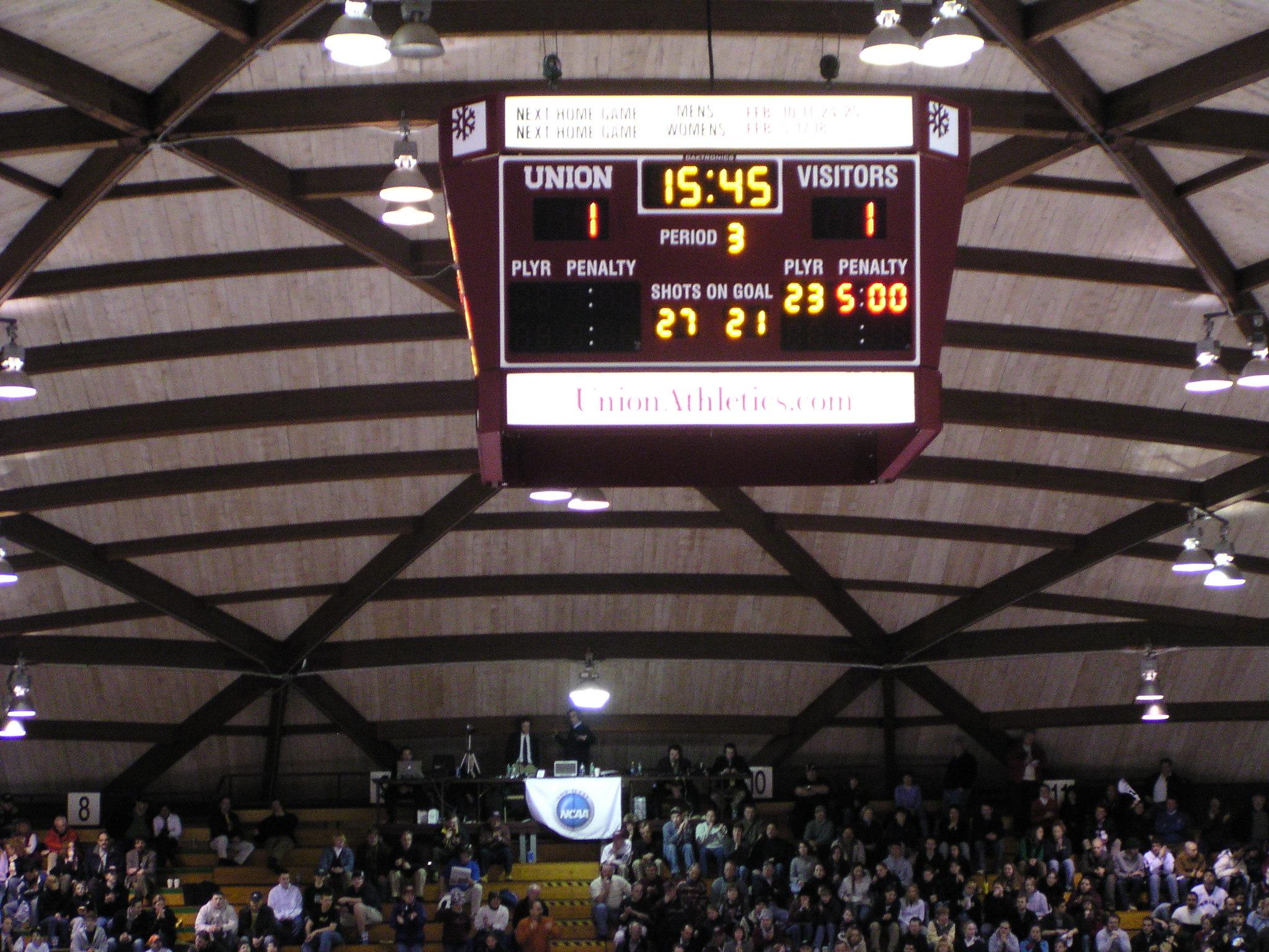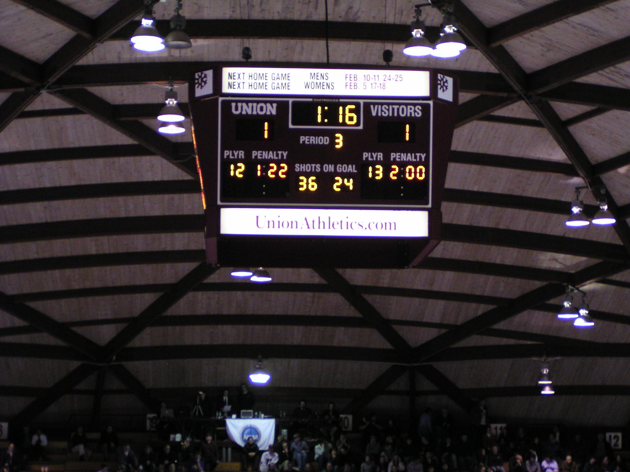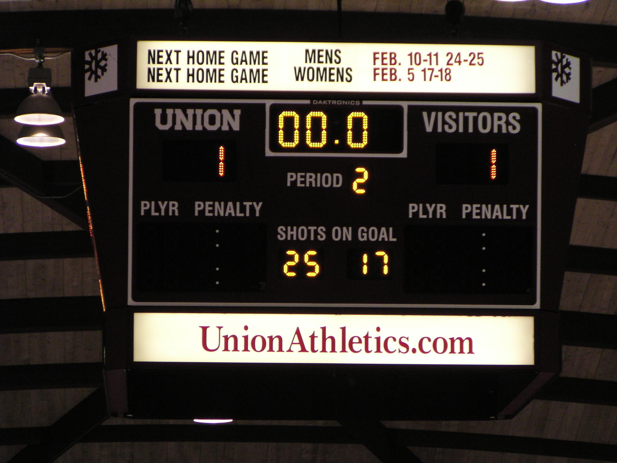 The Union ties it on a bouncing dump in on net from center ice by Torren Delforte for a weak power play goal. But it counts.