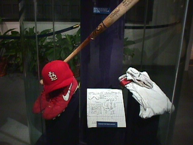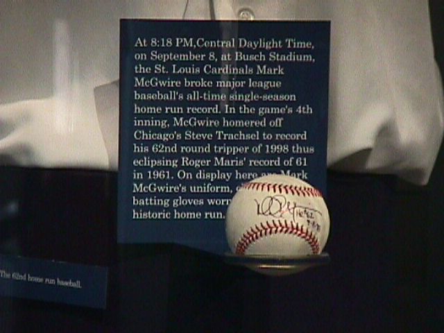 Just 60 hours after he was wearing, swinging, and hitting the stuff, here's the Mark McGwire stuff from home run #62. The display includes the ball and bat, each autographed, the jersey, cap, spikes, pants, socks, and Jack Buck's scorecard.