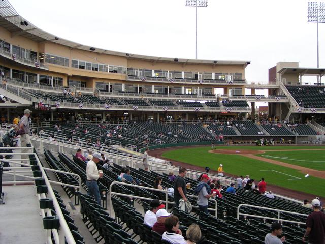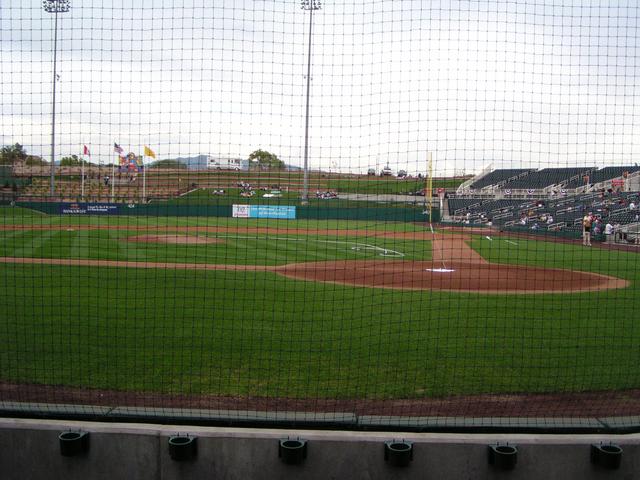 The view from my seat. Yes, right next to the Isotopes dugout. It helps when you only want to buy a single seat and you get it a few days ahead of time.