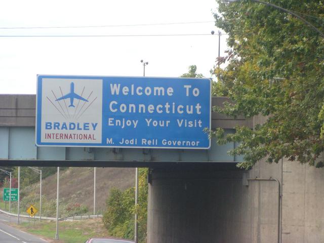 We are welcomed to Connecticut at the airport exit.