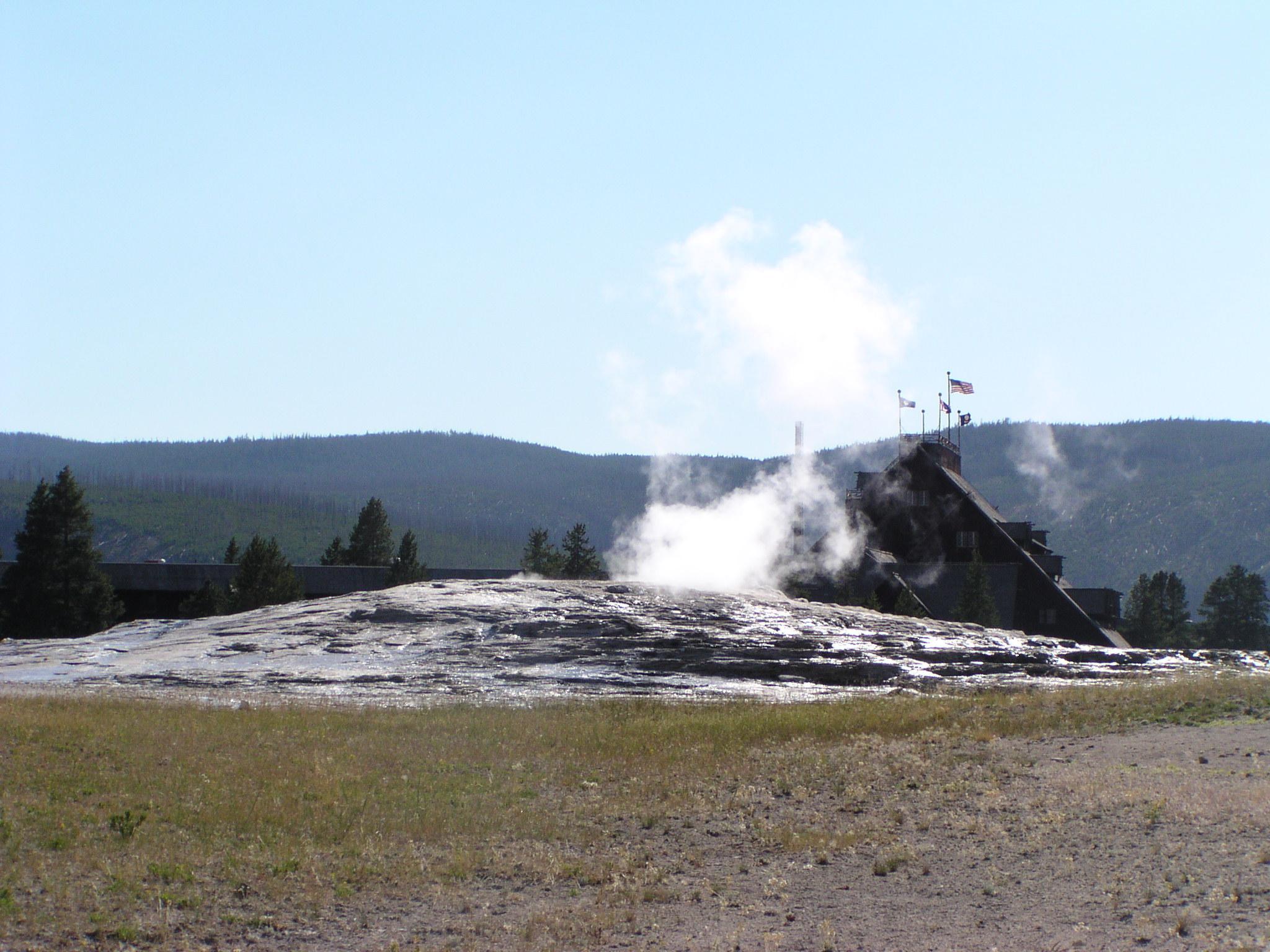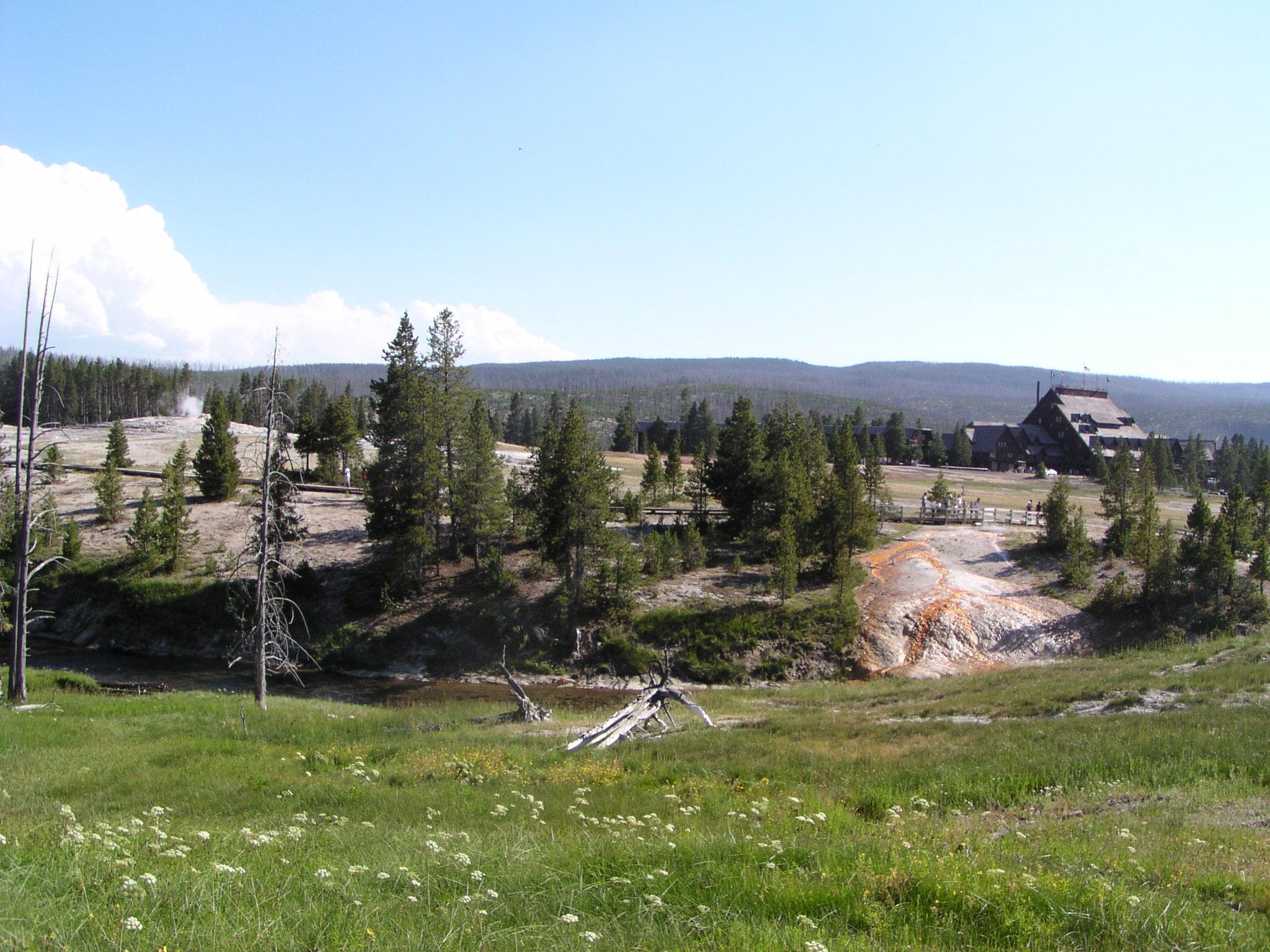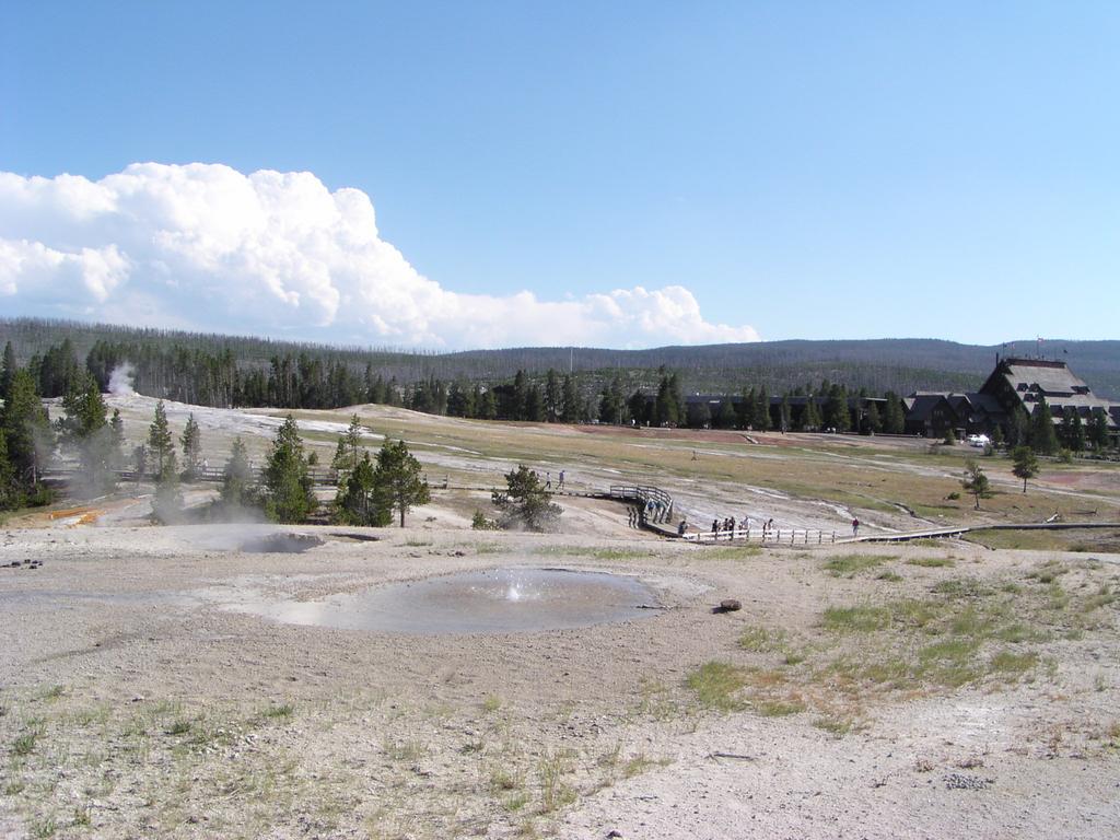 Old Faithful and the Old Faithful Inn from even further along Geyser Hill.