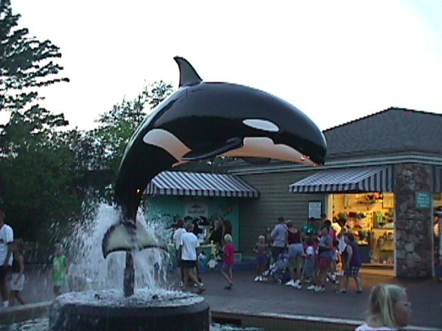 The fake shamu in a fountain at the entrance.