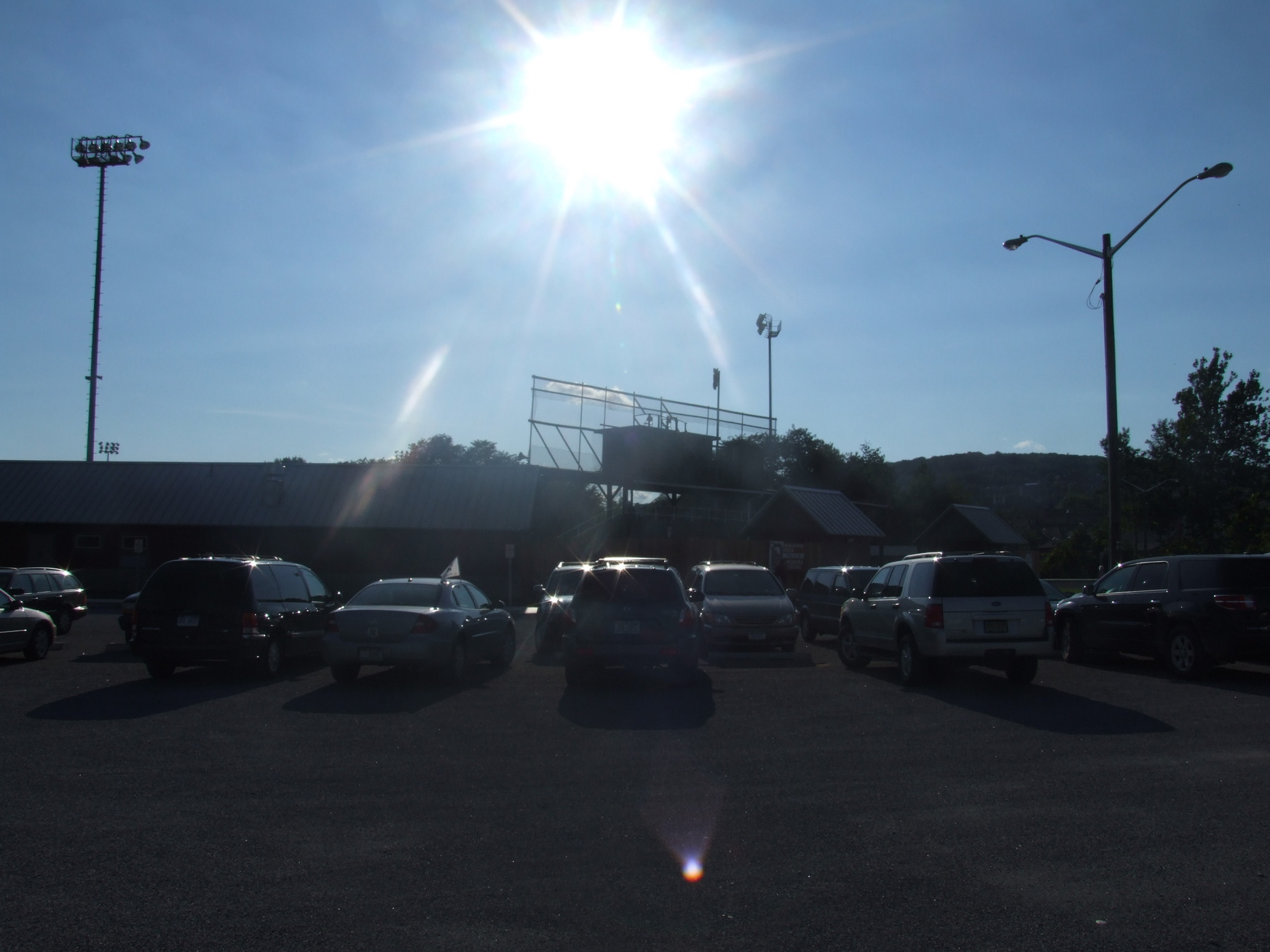 Great sunset over the third base grandstand.