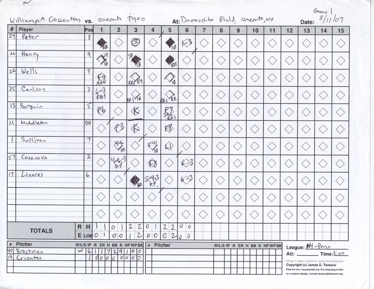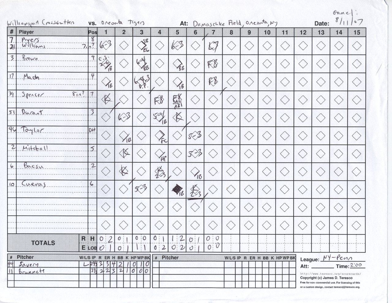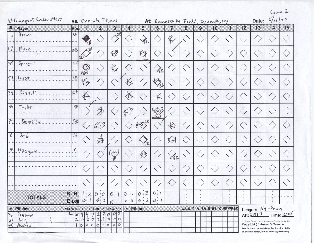 Williamsport Crosscutters vs. Oneonta Tigers, Damaschke Field, Oneonta, New York - August 11, 2007