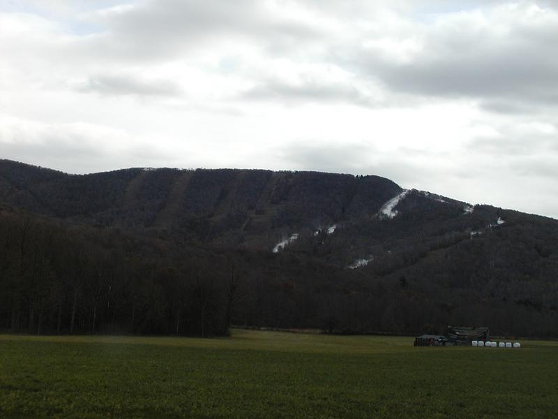 View of an early snowmaking effort at Jiminy Peak, from Route 43 in Hancock.