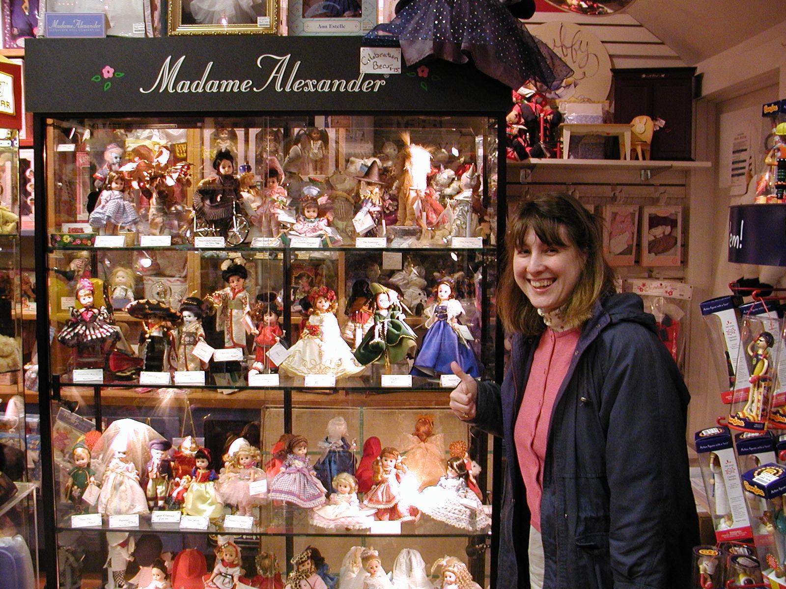 Anne and some dolls in a toy store.