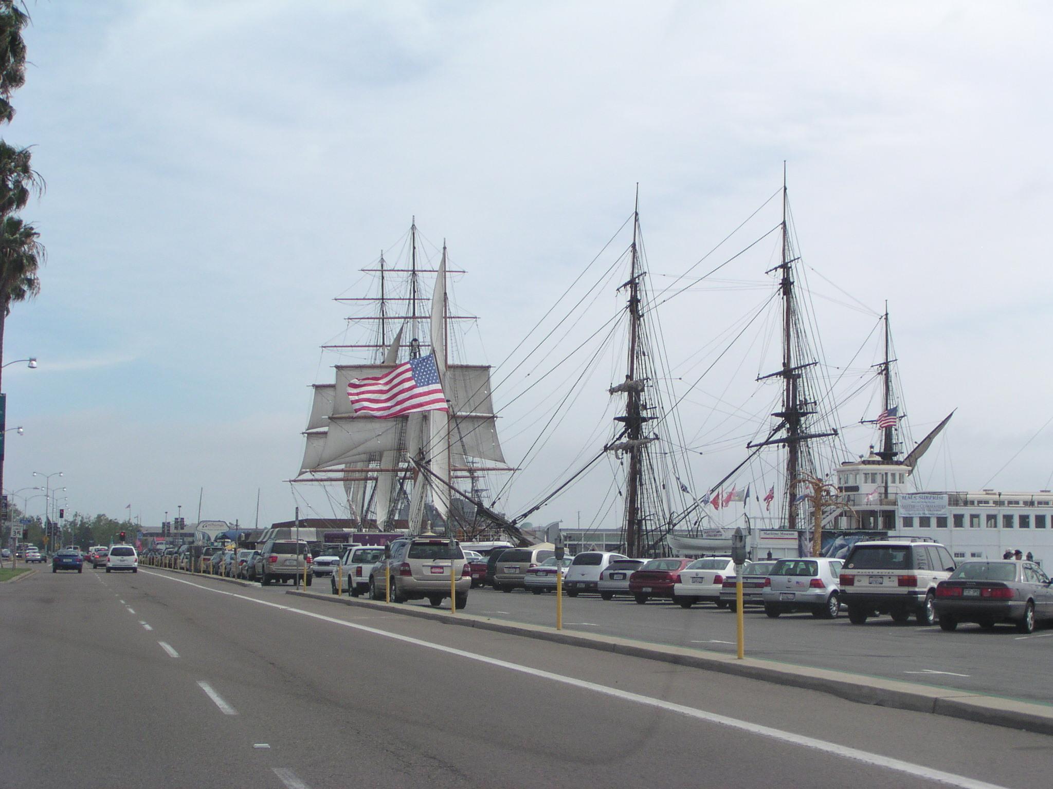 Some old ships that form a maritime museum at San Diego Harbor.