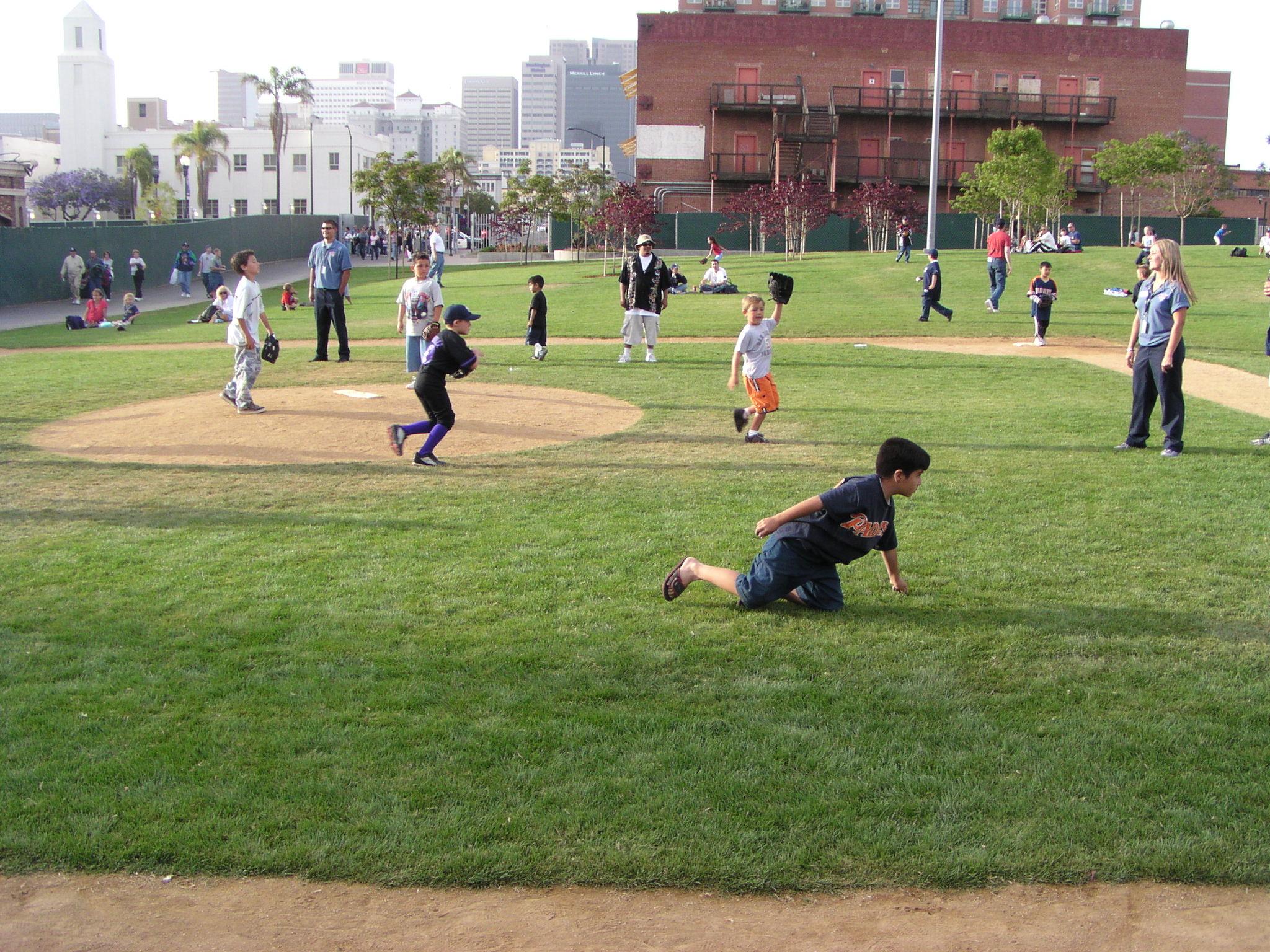 Out behind left center field, there is a park, where a bunch of kids were playing wiffle ball.