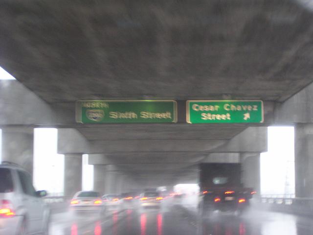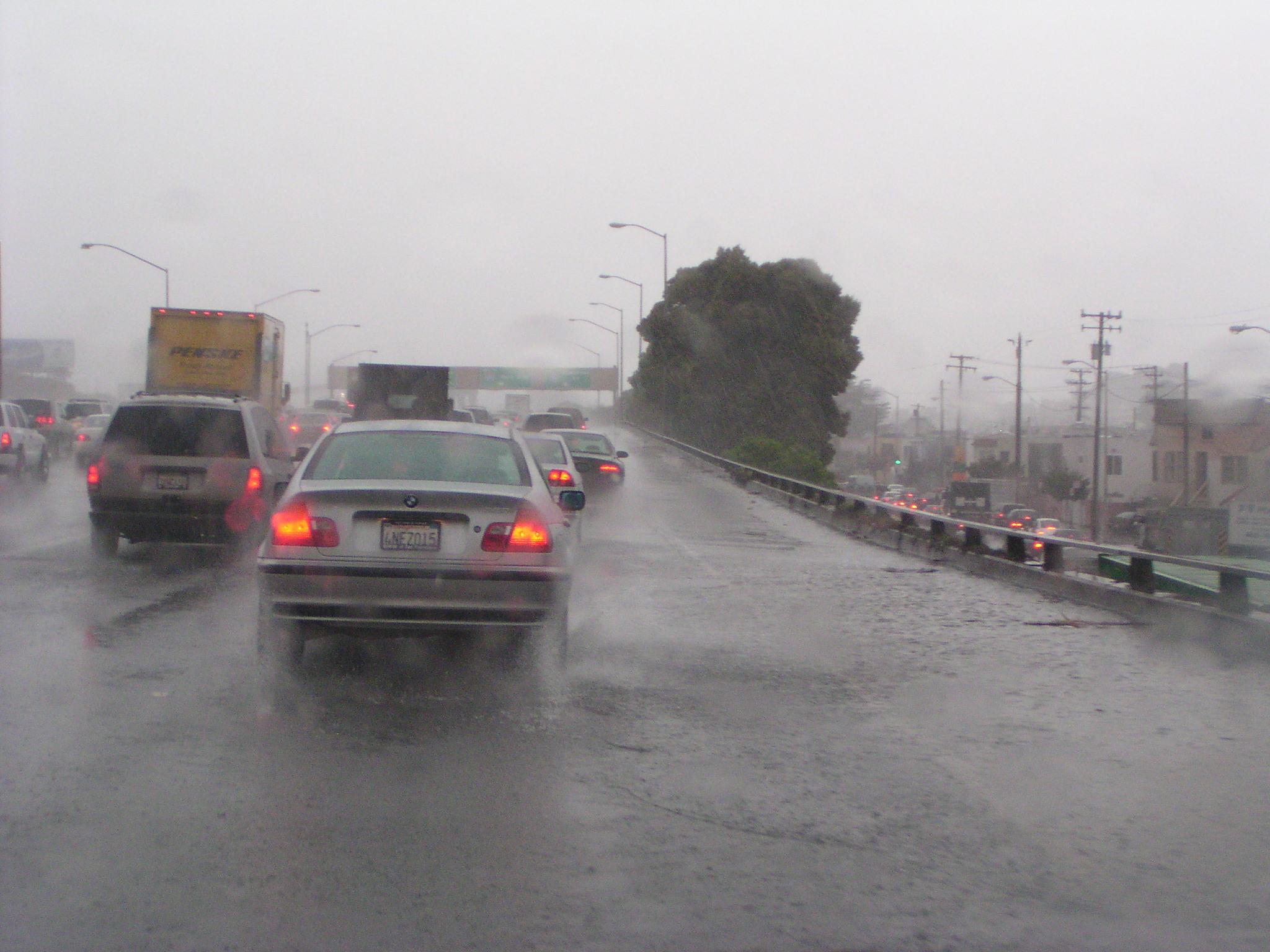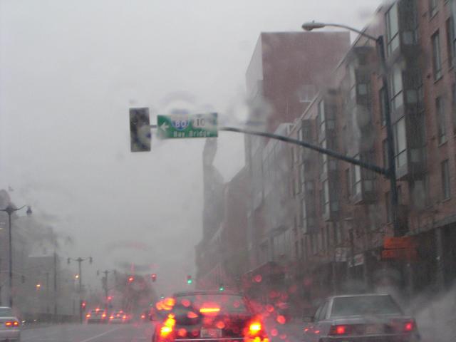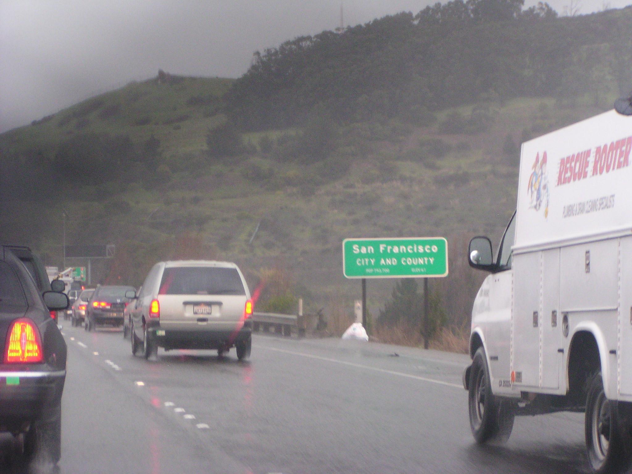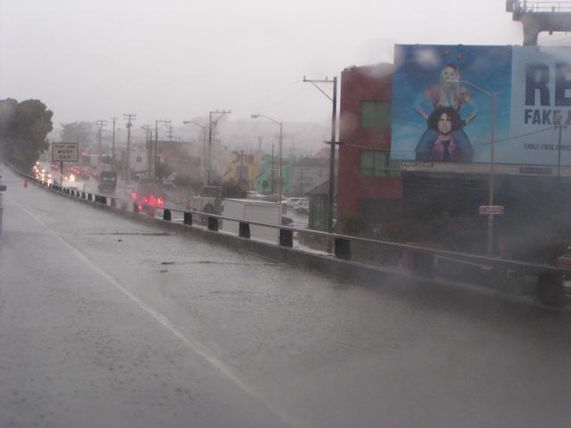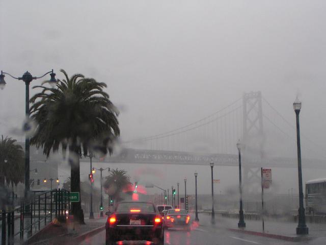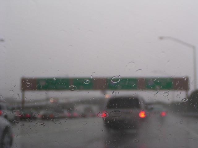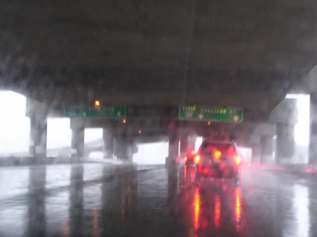 Road spray and wind-driven rain even under the double-decker highway segments here on I-280.