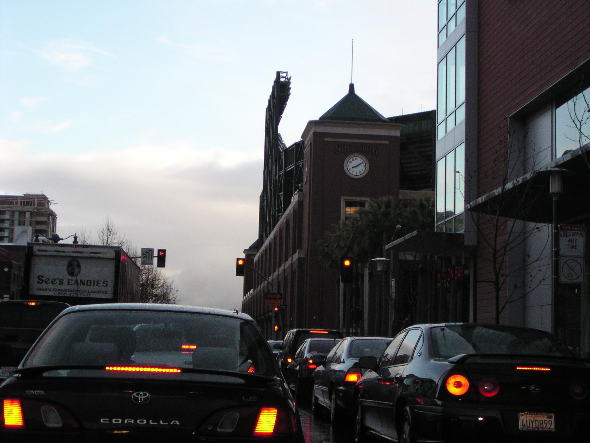 Passing a turn for the Bay Bridge with the lights of SBC Park in the background.