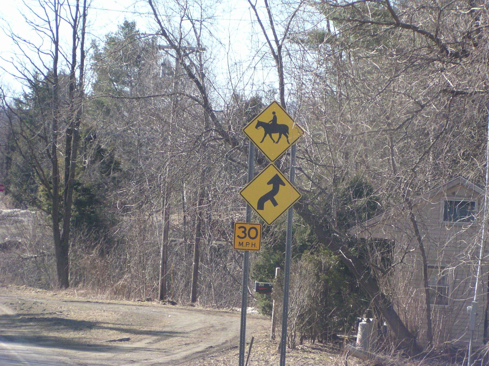 On Route 100 South, horses and a curve with a side street.