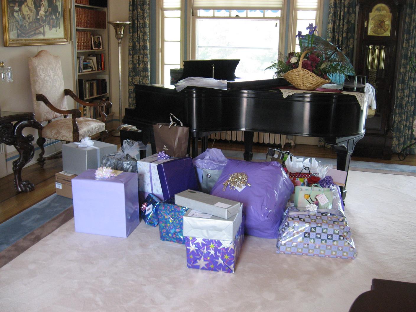 Gifts all wrapped in purple paper.