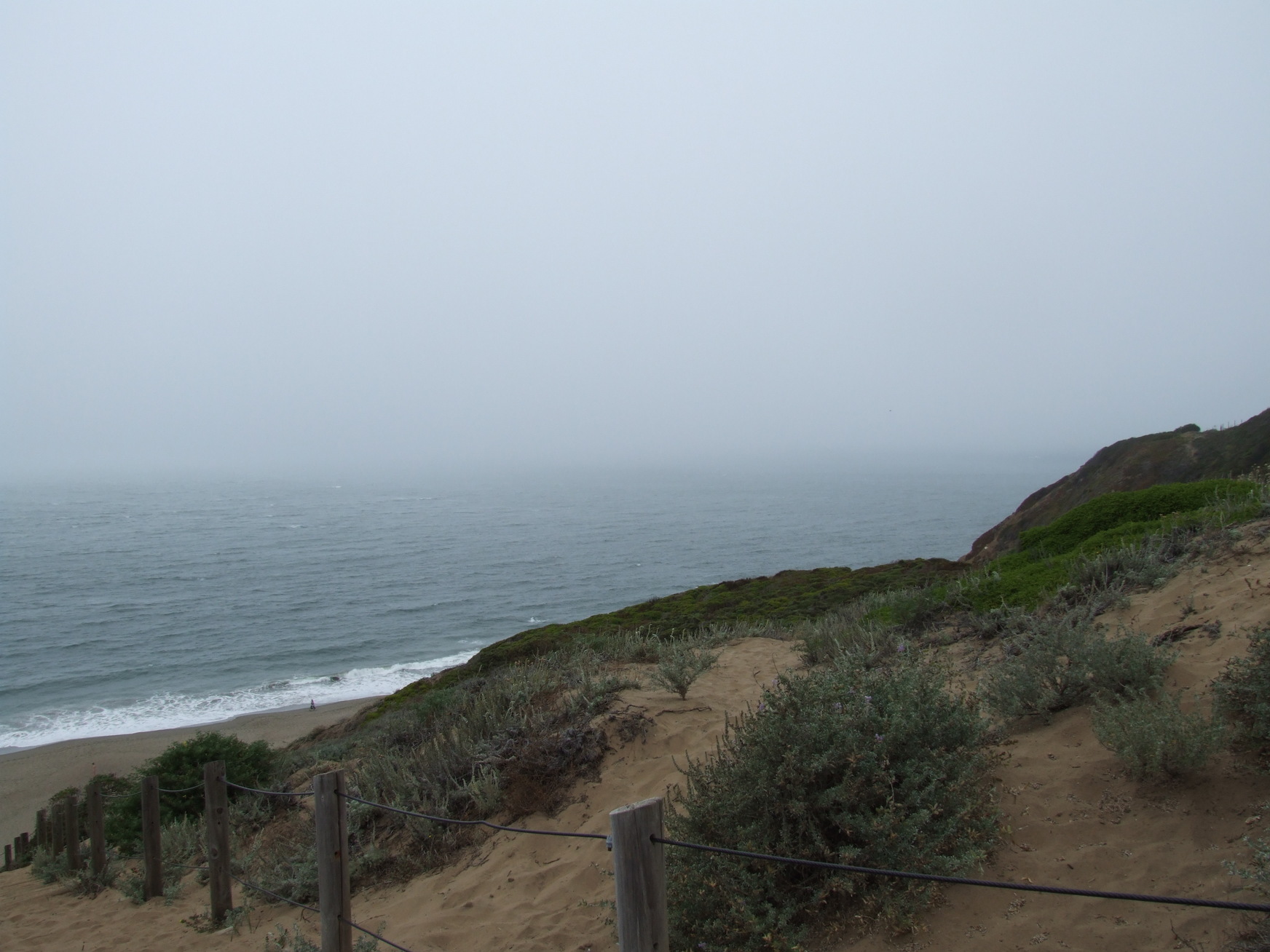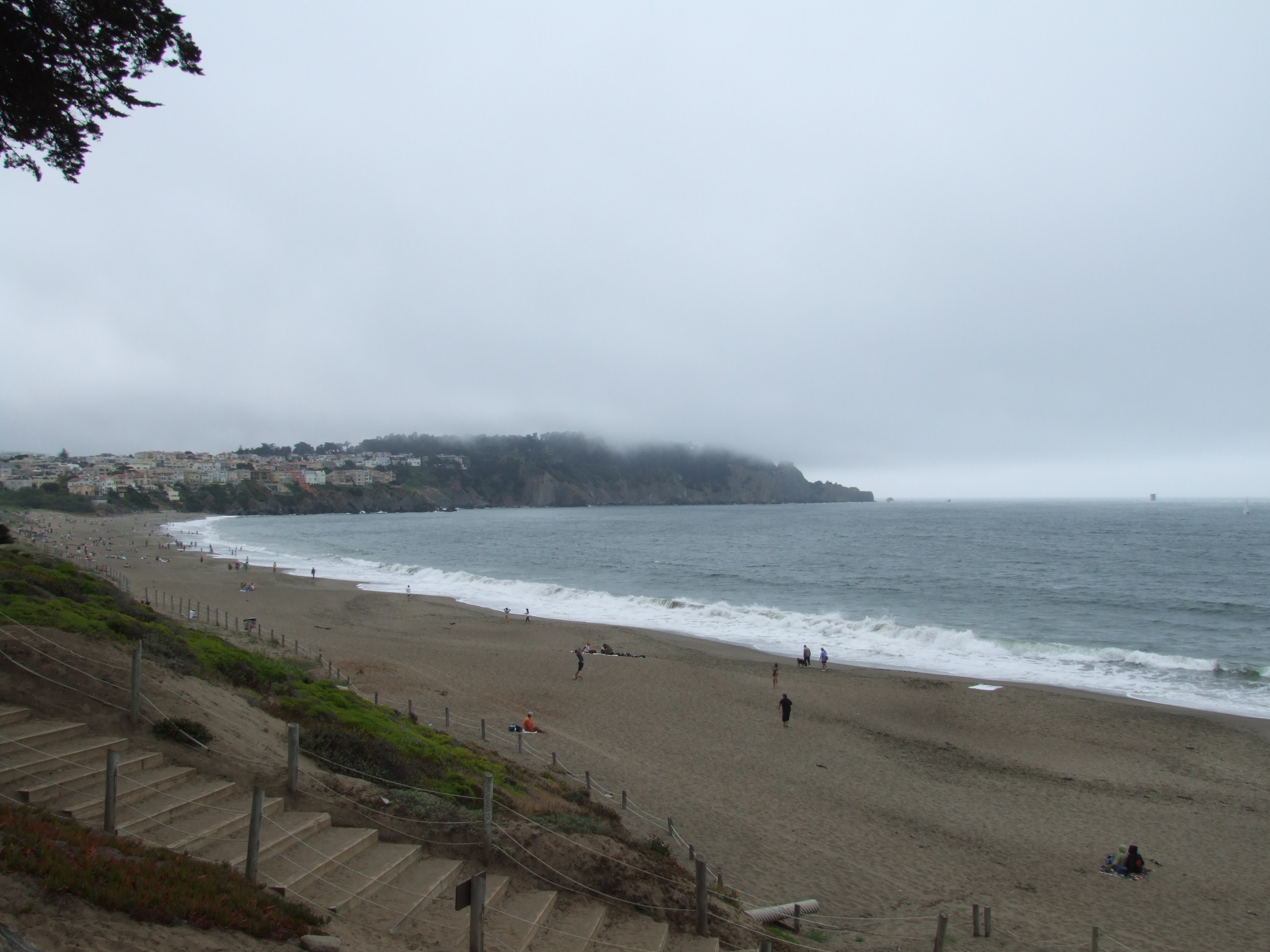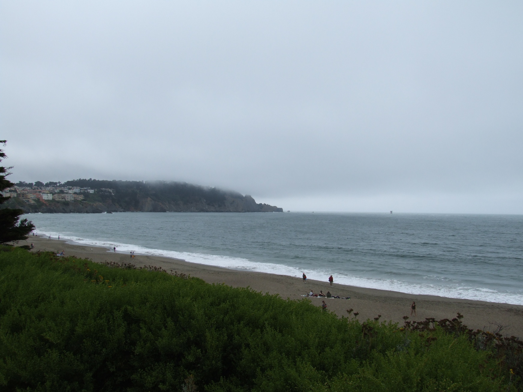 Some people were even in the water, despite a cool wind and fog and