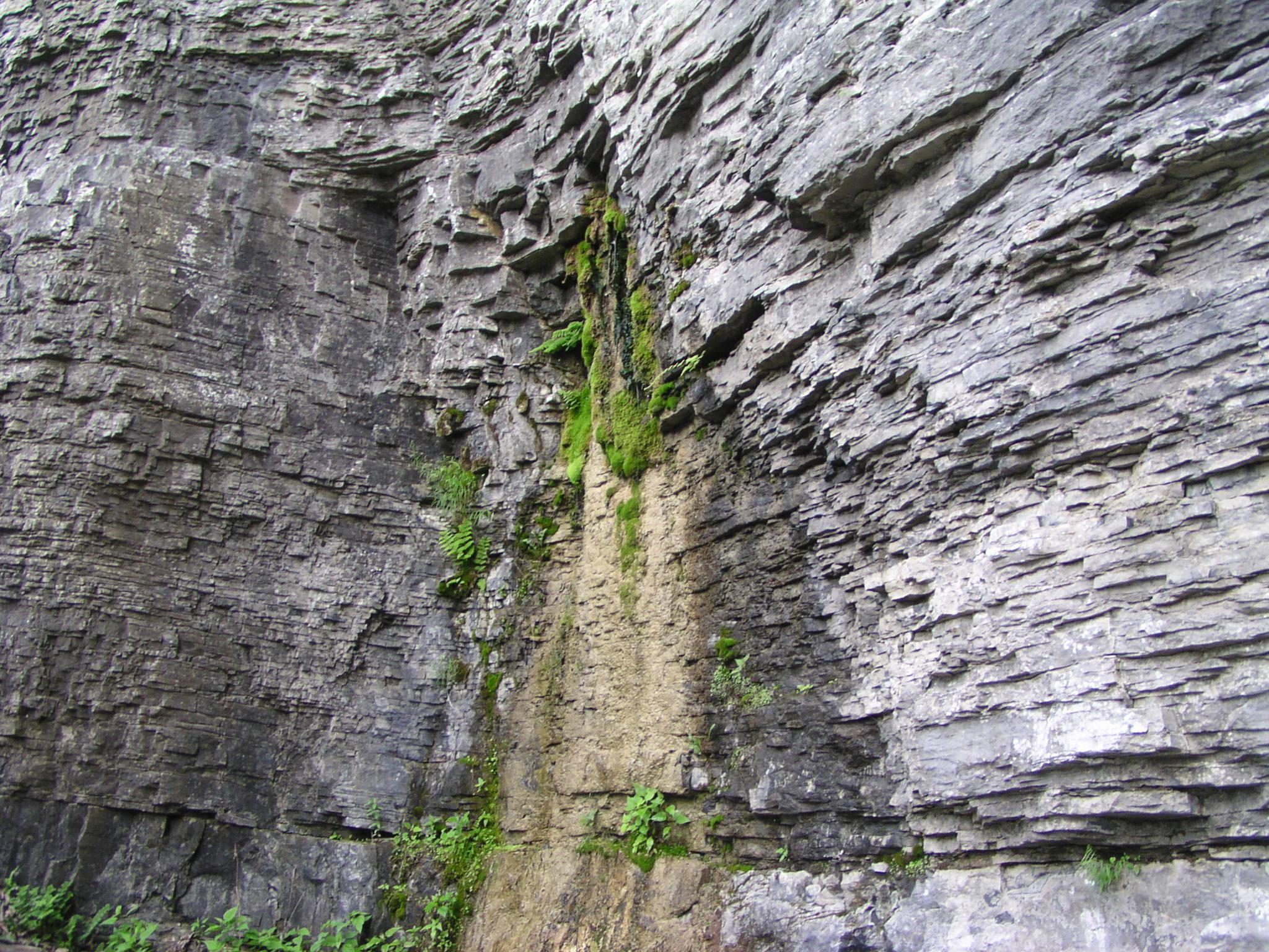 Moss growing where a smaller stream flows over the cliff.