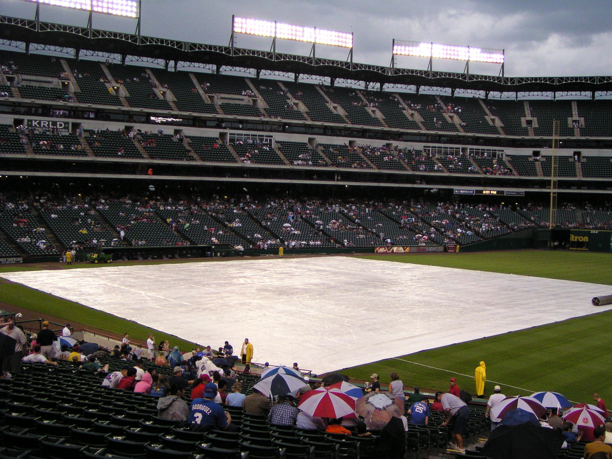 After about an hour and a half, the rain is gone and the grounds crew prepares the field.