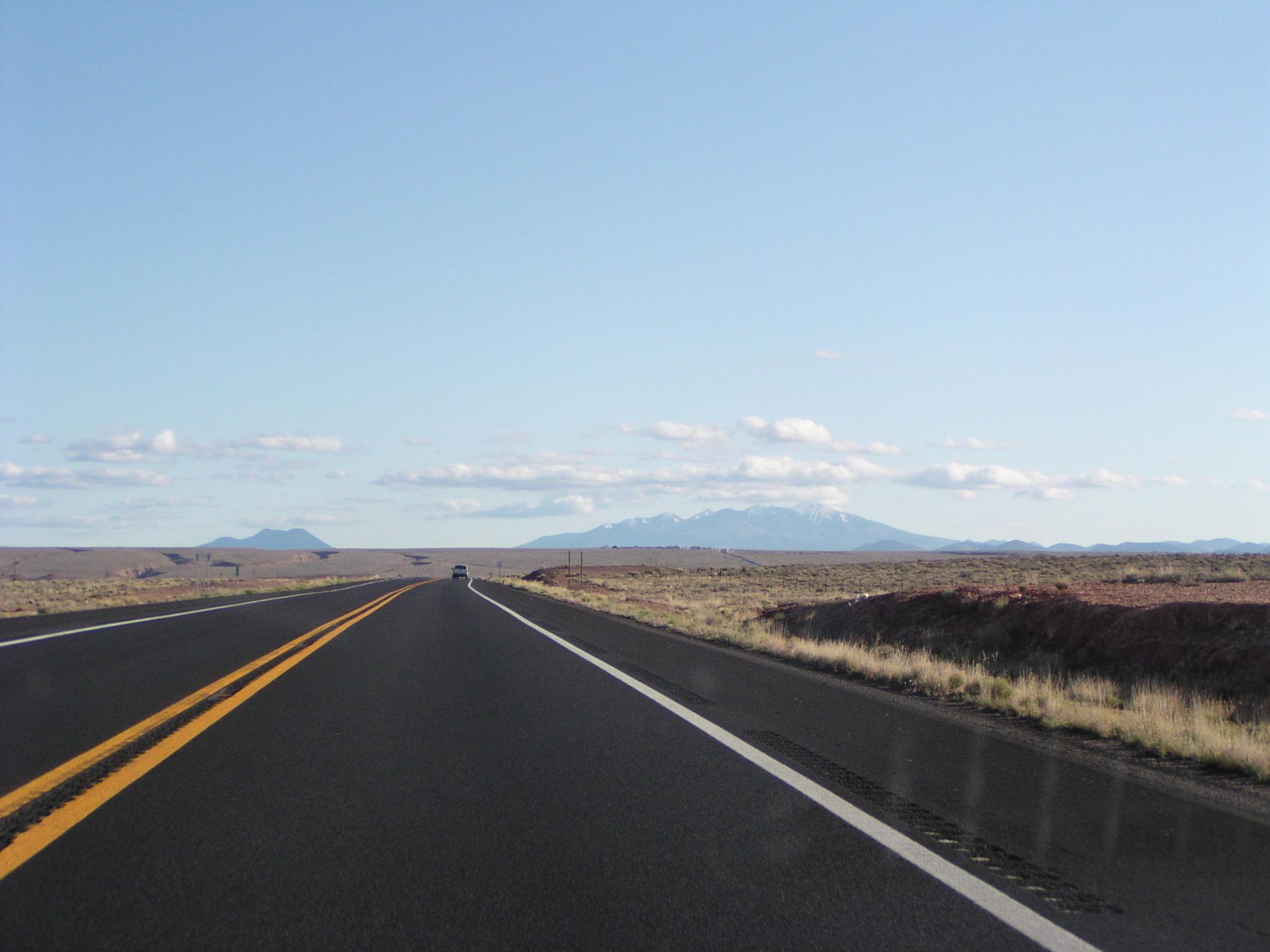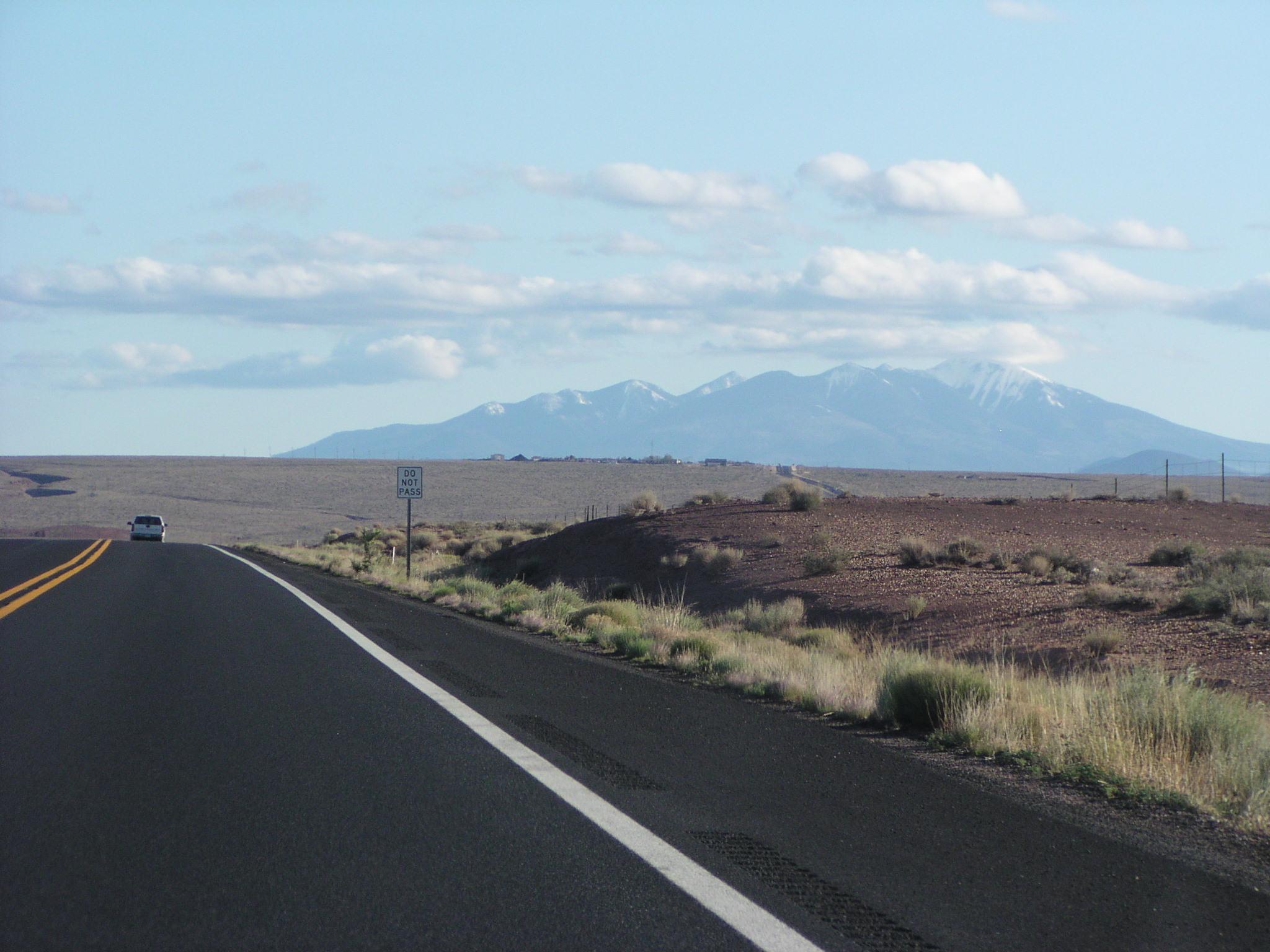 From probably 100 miles away, we start to see the San Francisco Mountains north of Flagstaff.