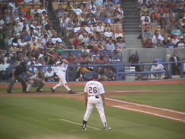 First base coach Rick Dempsey watched Eric Karros take a swing.