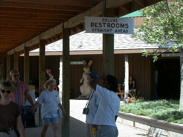 Nathan's picture of the bunny and "Deluxe" restrooms in the back yard at Wall Drug. [Bigger]